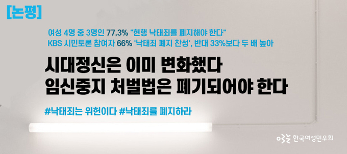 1953년 형법 제정 이후 국내에서 낙태는 죄로 처벌됐다. 민우회는 “이제 한국사회는 뚜렷한 시대적 변화를 체감하고 있다”고 강조했다. 2017년 11월 한 여론조사 전문기관의 조사 결과에 따르면 낙태죄 폐지에 대해 찬성이 51.9%, 반대 36.2%가 나왔다. 7년 전 같은 조사에서 ‘임신중지 허용 불가’ 53.1%, ‘임신중지 허용’ 33.5%였던 것과는 거의 정반대의 결과라고 민우회는 분석했다. 또한 2018년 4월 한국여성정책연구원 조사 결과에 따르면 전국 만 16세~44세 여성 4명 중 3명인 77.3%가 현행 낙태죄를 폐지해야 한다고 답했다.