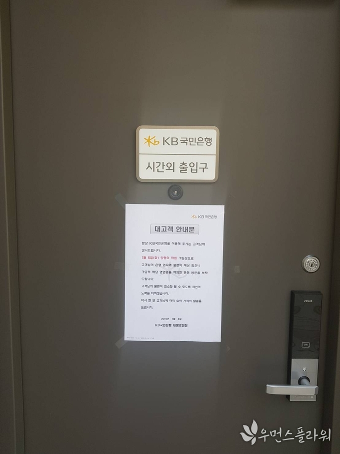 노조 측도 영업점에 입장을 게시했다. 전국금융산업노조 KB국민은행지부 측은 영업점마다 부착된 입장문을 통해 “2018년 실적 스트레스와 교통사고 등으로 KB국민은행 직원 10명이 사망했다”면서 “무리하게 실적을 채우기 위해서가 아니라 국민을 위해 일하고 싶어 하루 쉰다”고 강조했다.