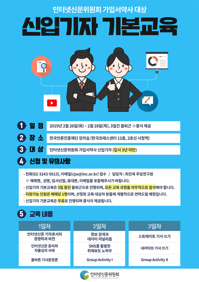 인터넷신문위원회가 윤리강령 참여서약사 신입기자를 대상으로 ‘신입기자 기본교육’을 진행한다. 이번 교육은 한국언론진흥재단의 지원을 받았다.