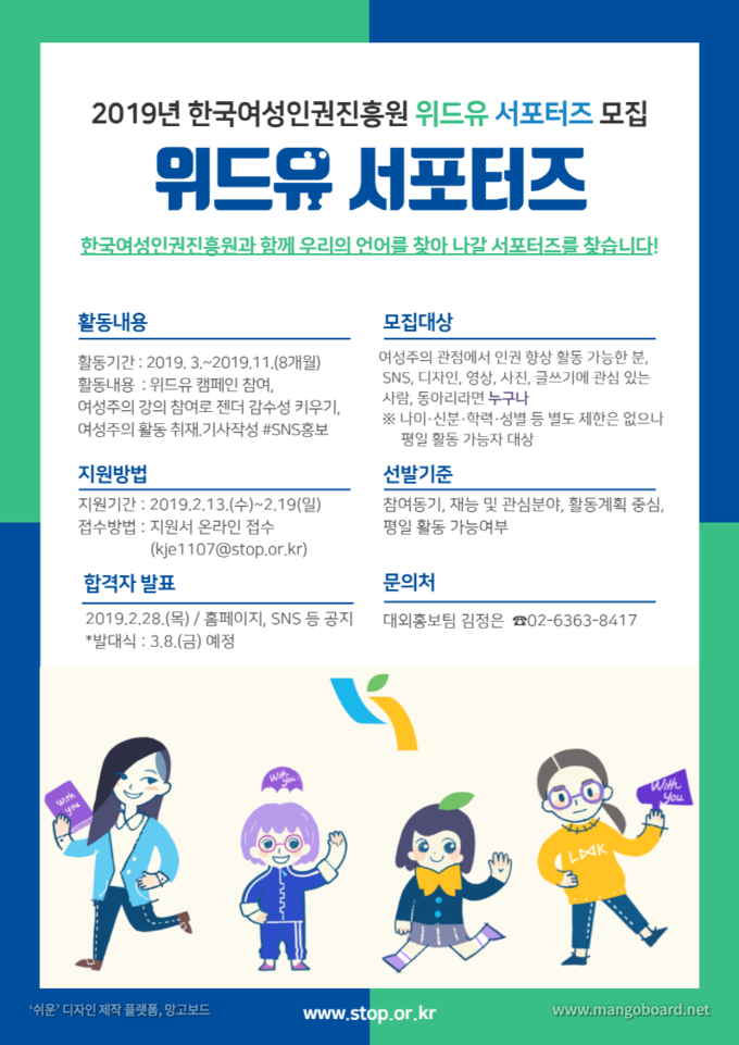 위드유 서포터즈는 다음달 8일 세계 여성의 날에 발대식을 시작으로 활동을 하게 된다. SNS 활동과 취재, 캠페인 등을 맡게 된다. 젠더감수성을 키우기 위한 교육에도 참여한다. 활동 기간은 11월까지다.