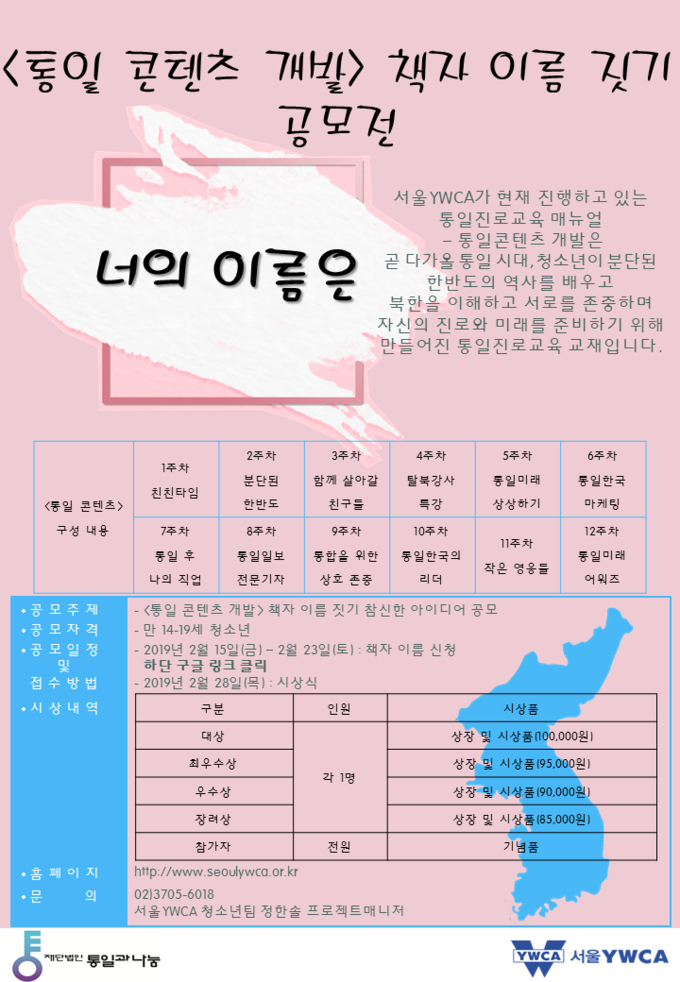 서울YWCA가 청소년 대상 통일교육 교재의 이름을 공모한다.